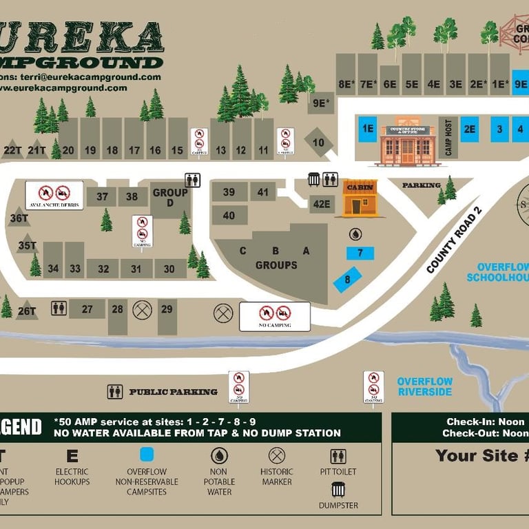 campgroundateureka@gmail.com970.618.3913No phone service at campground!Please leave message!